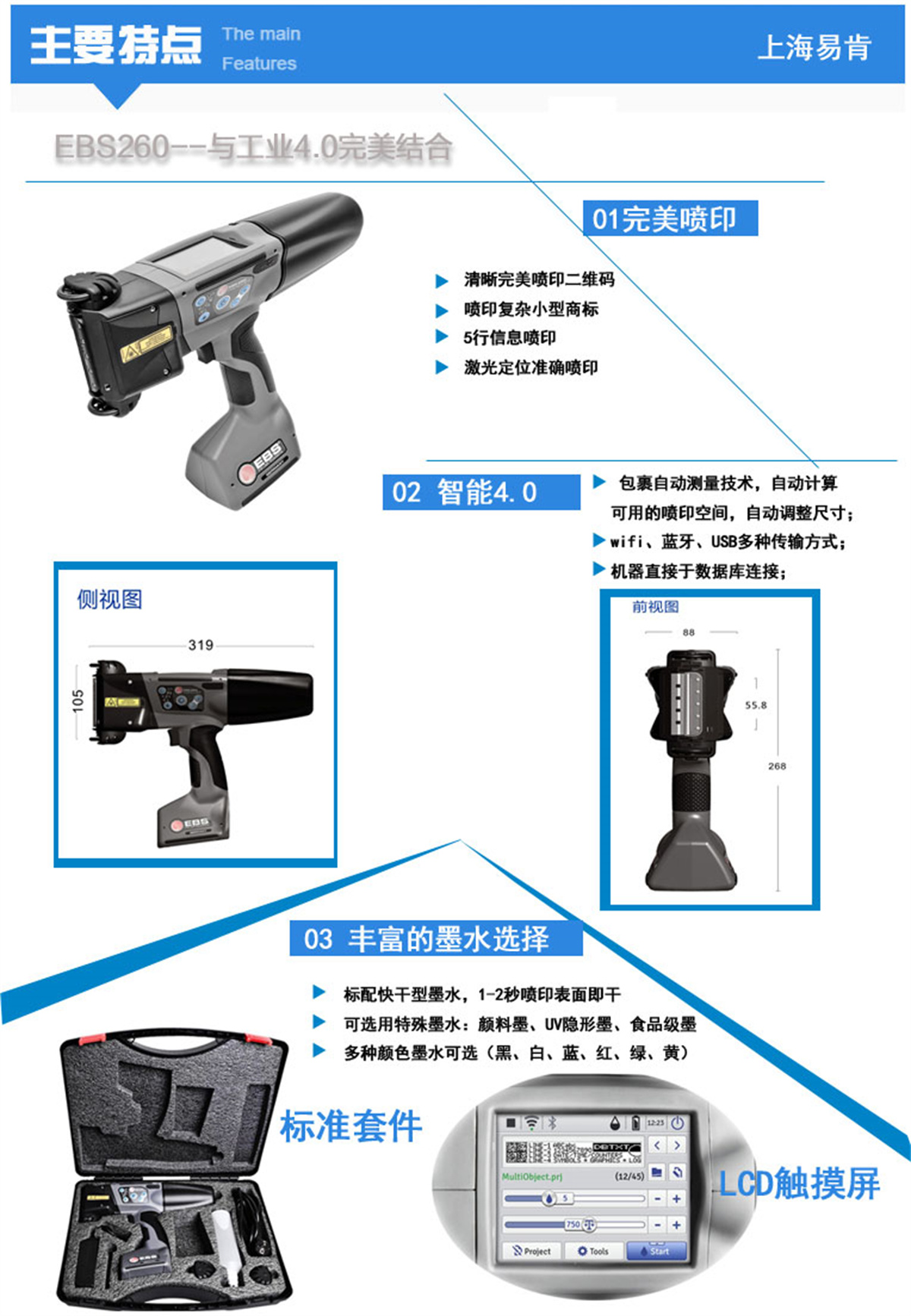 EBS-260是工業(yè)4.0德國(guó)新一代智能便攜手持噴碼機(jī),采用超大尺寸的加硬觸摸屏,噴印編輯一體,無需添加外設(shè)設(shè)備,可直接編輯、調(diào)整噴印內(nèi)容以及重要參數(shù),從而達(dá)到滿意的噴印效果。