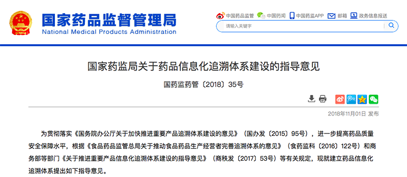 國家藥品監督管理局于2018年11月1日發布《國家藥監局關于藥品信息化追溯體系建設的指導意見 國藥監藥管〔2018〕35號》,以下簡稱《指導意見》。