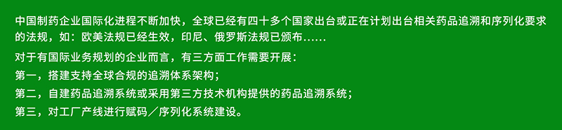 《指導意見》的工作目標:藥品上市許可持有人、生產企業、經營企業、使用單位通過信息化手段建立藥品追溯系統,及時準確記錄、保存藥品追溯數據,形成互聯互通藥品追溯數據鏈,實現藥品生產、流通和使用全過程來源可查、去向可追;有效防范非法藥品進入合法渠道;確保發生質量安全風險的藥品可召回、責任可追究。